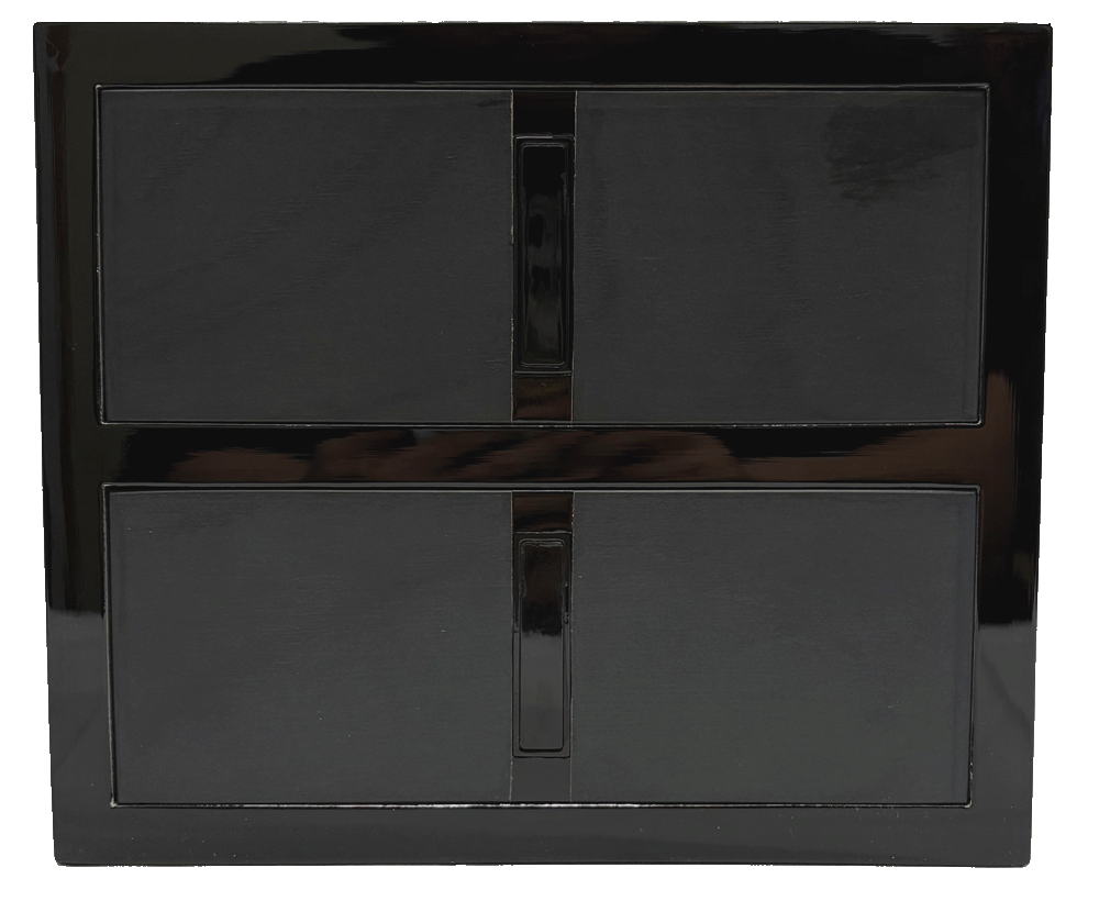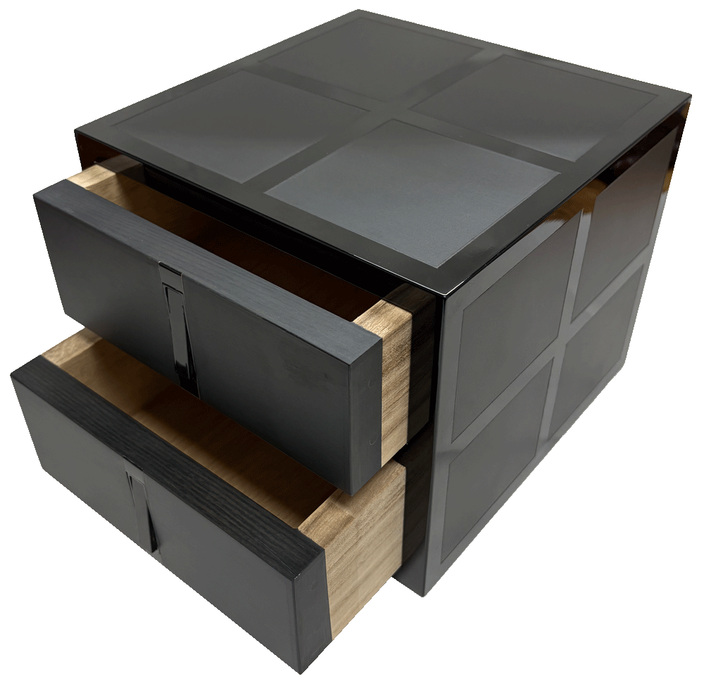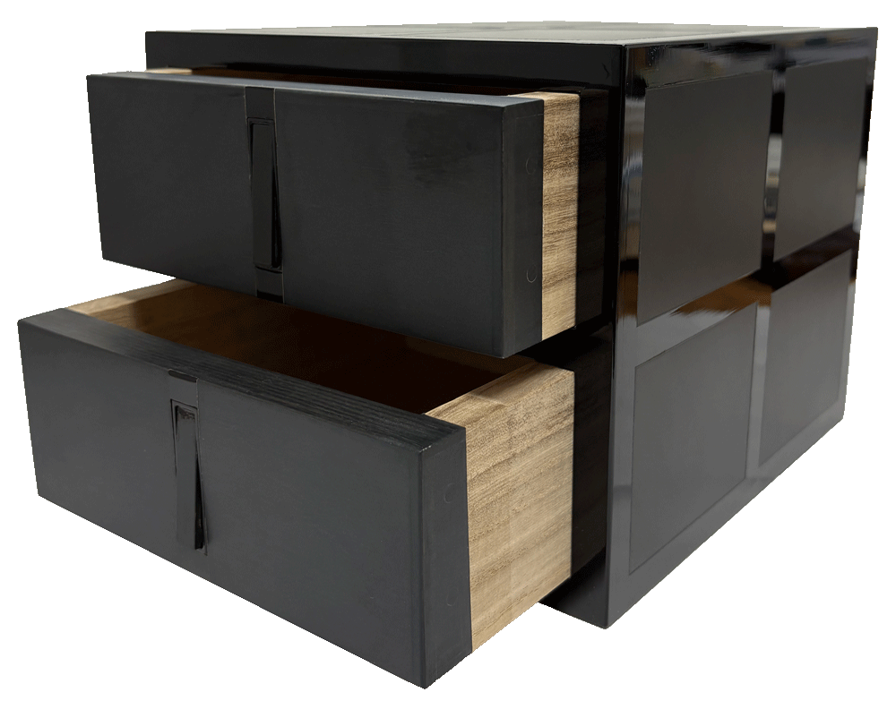 艶消し塗装と黒漆のグリッドが織りなす静謐な造形。伝統の枠を超えた、新たな仙台箪笥の表現です。